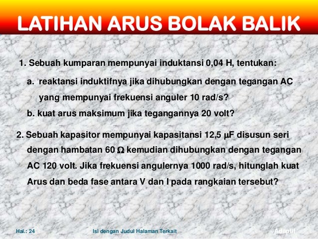 V = 100 sin 100 t volt. Arus bolak balik adalah arus dan tegangan listrik yang besarnya berubah terhadap waktu dan mengalir nilai hambatan inductor ini bergantuk pada frekuensi sudut dari arus bolak balik. Sebuah kapasitor dialiri arus bolak balik dengan frekuensi f, tegangan v dan mengalirkan arus i. Arus listrik bolak balik dalam bahasa inggris disebut alternatif current (ac), arus ini dihasilkan oleh generator. Pada rangkaian arus bolak balik baik itu tegangan atau kuat arus, maka akan selalu berubah ubah secara periodik.